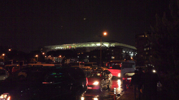 Von dort sollte es mit dem Taxi bis zum Stadion gehen, doch auf Anraten des Wirtes gingen wir den 10minütigen Weg zu Fuß, da die Taxen einen Umweg fahren würden und dies nicht billig sei. Gesagt getan, einmal die Straße runter und einmal einen leichten Anstieg die nächste Straße herauf, schon war man an Sükrü-Saracoglu-Stadion von Fenerbahce. Dort erlebte man aber erneut ähnlich wie schon in Marseille - ein Chaos bei den Einlasskontrollen. Es schien erneut, und dies wurde uns auch im Nachhinein von Einheimischen bestätigt, dass man in Europa ein so hohes Fanaufkommen der Gastmannschaft nicht gewohnt ist. Alle ca. 3.000 bis 3.500 Gladbacher mussten durch einen Einlass in der Größe einer doppelten Türbreite hindurchgeschleust werden. Auch hier blieb der Mob erstaunlich ruhig und das Gedränge vor dem Gitter hielt sich in Grenzen. So waren wir gerade einmal 10 Minuten vor Anpfiff auf den Rängen und staunten über die türkische Architektur nicht schlecht, da ein Teil der Sitzplätze im Gästebereich extrem sichtbehindert waren. Hatte man das Glück, einen Platz ganz links im Block zu bekommen, war die Sicht auf das Spielfeld aufgrund einer riesigen Betonwand nur bis maximal zur Mittellinie möglich. Also hieß es sich möglichst rechts in den Block zu quetschen damit man das Spiel der beiden B-Mannschaften verfolgen konnte.