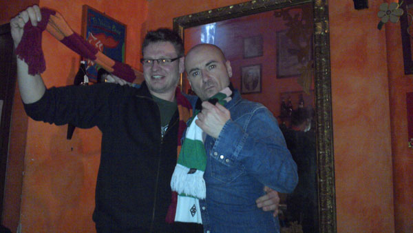 Auch hier zeigte Zetti seine sportlichen Eigenschaften, die er sich im Reckenfelder Trainingslager eigens antrainiert hatte und nörgelte erst am Ende des ca. 3km langen Fußmarsches, er fühle sich bei Gullivers Reisen. Am Strand angekommen erwartete uns ein imposantes Bild. Einige hundert Borussen vertrieben sich hier die Zeit bis zum Spiel. Darunter viele bekannte Gesichter, wie den Saerbeckern Schäpse, Schlauti. und unserem Ex-König Patrick Kehrings, die sich der Bustour unseres Regionalbetreuers Caki anschlossen und eine 18-Std-Bustour zur Anreise in Kauf nahmen. Leider war die Strandbar diesen Ansturm wohl nicht gewohnt, da lediglich eine Bude zum Kauf von nicht wirklich gekühlten Getränken zur Verfügung stand. Aufgrund dessen verzogen wir uns in ein Strandcafe und beobachteten von dort das schwarz-weiß-grüne Treiben. Gegen kurz nach 16:00 Uhr rottete sich der Gladbach-Mobb zusammen, ein sicheres Zeichen dafür, dass der Fanmarsch zum Stadion anstand. Leider erfolgte dieser nicht über die breite Hauptstraße sondern über eine kleine Parallelstraße, die von den Anwohnern wohl als Parkzone benutzt wird. Dies hatte unrühmlicherweise zur Folge, dass einige Gladbacher Sympathisanten die geparkten Autos zerkratzten oder demolierten. Leider verträgt halt nicht jeder den Alkohol. Nach gut 1,5 stündigem Marsch hatte der Tross die ca. 2km lange
