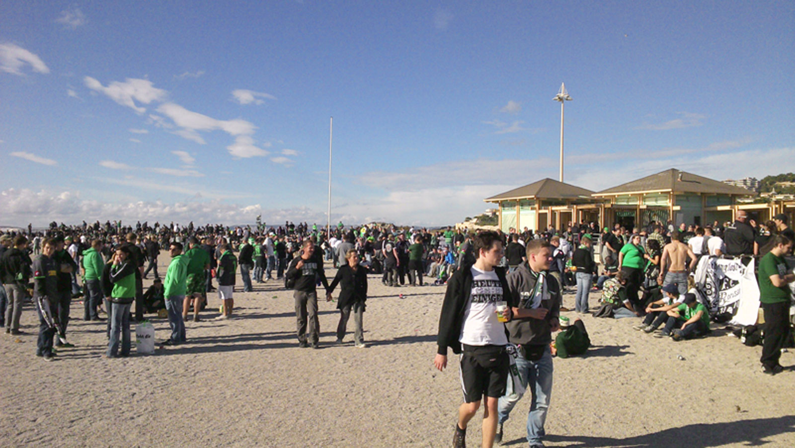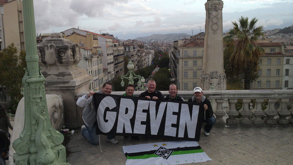 welches bereits im hannoveraner Bahnhof zuschlagen sollte. Marseille in schwarz-weiß-grün Donnerstag, 08.11.2012 um 01:00 Uhr morgens trafen sich die Mitglieder der MSL-Fohlen Mütze, Psycho und Tegt unter der Führung des Vorstands Effe und Zetti am Café Ambiente zur ersten Europapokal-Auswärtstour des Fanclubs seit 15 Jahren. In der Großraumlimousine von Psycho machten sich die fünf auf zum ersten Zwischenstopp der P&R-Parkplatz in Ascheberg, wo Tourplaner Harry sich nebst seiner Tochter und Ulli vom Fanclub LüdinghausenerJungs anschlossen. Und Harry hatte sich eine besondere Reiseroute ausgedacht: Ziel war der Airport im nordfranzösischen Lille, den man mit den beiden PKW's nach dem 2. Zwischenstopp in Solingen, an dem Olaf und Sohn Daniel zustiegen, nach einer Fahrt einmal Quer durch Belgien um 6:30 Uhr erreichte. Bereits auf dem Weg dorthin wurde klar, dass nicht nur wir eine außergewöhnliche Route gewählt hatte. So traf man auf der Reise an einem belgischen Rastplatz einige BORUSSIA-Fans aus Frankfurt, die vom belgischen Flughafen in Chaleroi den Weg nach Marseille antraten. Tja so ist das nun mal, wenn man einen Flughafen direkt vor der Haustür hat und aus finanziellen Aspekten trotzdem einen längeren Weg zu einem anderen Flughafen auf sich nimmt - Paradox ;) Da Harry's Tochter Vanessa das einchecken für alle übernommen hatte, konnten wir Zetti nochmals darüber aufklären, dass man im Handgepäck keine größeren Tuben als 100ml mit Haargel oder Shampoo mitnehmen dürfte. Zetti tat so, als hätte er vom 11. September noch nie gehört und protestierte gegen diese Regelung. Nachdem Effe ihm einen Zippbeutel gegeben hatte und er sein Haargel portionsweise abfüllte, konnte er die Sicherheitsschleuse problemlos passieren. Jedoch scheint man in Frankreich nicht wirklich viel auf Gepäckkontrolle zu achten, da Zetti trotz Abfüllmaßnahme seine großen Hygieneartikelpackungen durchschleuste! Vive la France Der Flug verlief problemlos und ruhig, da alle ihn zum Nachholen des Schlafbedarfs nutzten. Nach gut 1,5 Stunden Flug landeten wir in Marseille, auch wenn Zetti Angst hatte wir würden eine Wasserlandung hinlegen, da wir vom Mittelmeer aus die Landebahn ansteuerten. Bei 20° Celsius und herrlichem Sonnenschein ging es vom Flughafen mit dem Bustransfer Richtung Hauptbahnhof Marseille und von dort mit der U-Bahn zum Hostel in der Nähe des Stade Vélodrome (Stadion Marseille). Kurz eingecheckt und ab zur vom Fanprojekt Mönchengladbach organisierten Fanparty am Strand von Marseille.