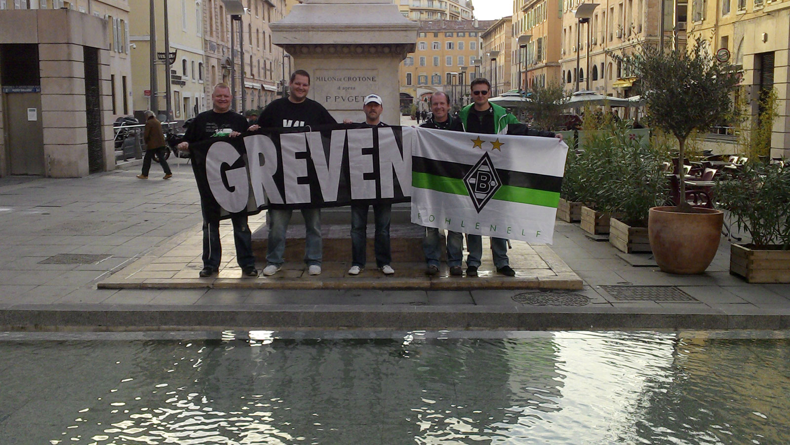Höhepunkt war jedoch die Turnhalle vor dem Gästeaufgang. Durch diese Halle wurden alle Gladbachfans geschleust, egal ob sie in den Gästeblock gehörten oder nicht. Zudem wurde von Seiten der französischen Polizei in dieser Halle wohl vorsorglich Tränengas versprüht, welches seine Wirkung nicht verfehlte. Ferner war es aufgrund der Massen ziemlich eng und eine Beschilderung der Richtung fehlte völlig. In Deutschland werden da Erinnerungen an die Loveparade-Katastrophe wach, von der man in Frankreich anscheinend keine Kenntnis genommen hat. Da fragt man sich, was würde hier passieren, wenn nicht Gladbach mit größtenteils friedlichen bzw. vernünftigen Fans kommt, sondern Eintracht Frankfurt oder Dynamo Dresden hier einfallen ? Ach ja, eine Kontrolle der Eintrittskarten ist nicht erfolgt, sodass man auch ohne Ticket das Spiel hätte sehen können - großartig! Im Stadion selbst bot sich ein imposantes Bild. Nicht nur weil die komplette Gegengeraden aufgrund des Stadionumbaus als Gästekurve diente. Nein! Auch der komplette Oberrang der Haupttribüne wurde von Borussen besiedelt, sodass Wechselgesänge erfolgten und das Spiel in Marseille zu einem stimmlichen Heimspiel wurde. Die tatsächliche Zahl der VfL-Anhänger schwankte zwischen 3500 bis 6000, der offizielle 15.571. Die Wahrheit liegt wahrscheinlich bei 4000 - 4500. Jedoch haben die übrigen Marseiller richtig Lärm fabriziert, wenn sie denn mal aktiv wurden - Respekt! Zum Spiel selber bleibt zu sagen, 1. Halbzeit richtig gut und clever, 2. Halbzeit durch eigene Fehler Olympique zurück ins Spiel geholfen und zum Schluss musste wieder Retter-Juan eingreifen. Derzeit goldwert der Junge. Das Verlassen des Stadions zog sich hin, da der Gladbacher Anhang fast 1 Stunde im Block verbleiben musste, eher die Tore geöffnet wurden, obwohl das Stadion nach 5 Minuten von den restlichen Zuschauern komplett geleert war. Abschließend ließen wir den Abend mit einem französischen Deliktess-Abendessen (Döner Kebab mit Pommes) und ein/zwei Kaltschalen ausklingen um nach ausreichend Schlaf den nächsten Tag mit einem hervorragenden Frühstück zu beginnen. Diesen verbrachten wir am Hafen, wo sich ebenfalls noch einige Gladbacher aufhielten um bis zur Rückreise den Tag zu verbringen. Um 16 Uhr machten wir uns in Richtung Flughafen auf um unseren Fliegern gen Lille nicht zu verpassen. Am Bahnhof in Marseille war Zetti vom französischen Stadtpanorama so überwältigt, dass die 10köpfige Gruppe unbedingt zu einem Gruppenfoto genötigt werden musste. Gesagt getan und nach dem ebenfalls ruhigen Rückflug fuhr Psycho uns über Belgien und Holland in Duisburg wieder in die Heimat, die wir gegen 3.30 Uhr am Samstagmorgen erreichten. Fazit: eine gelungene Tour der MSL-Fohlen zurück nach Europa,